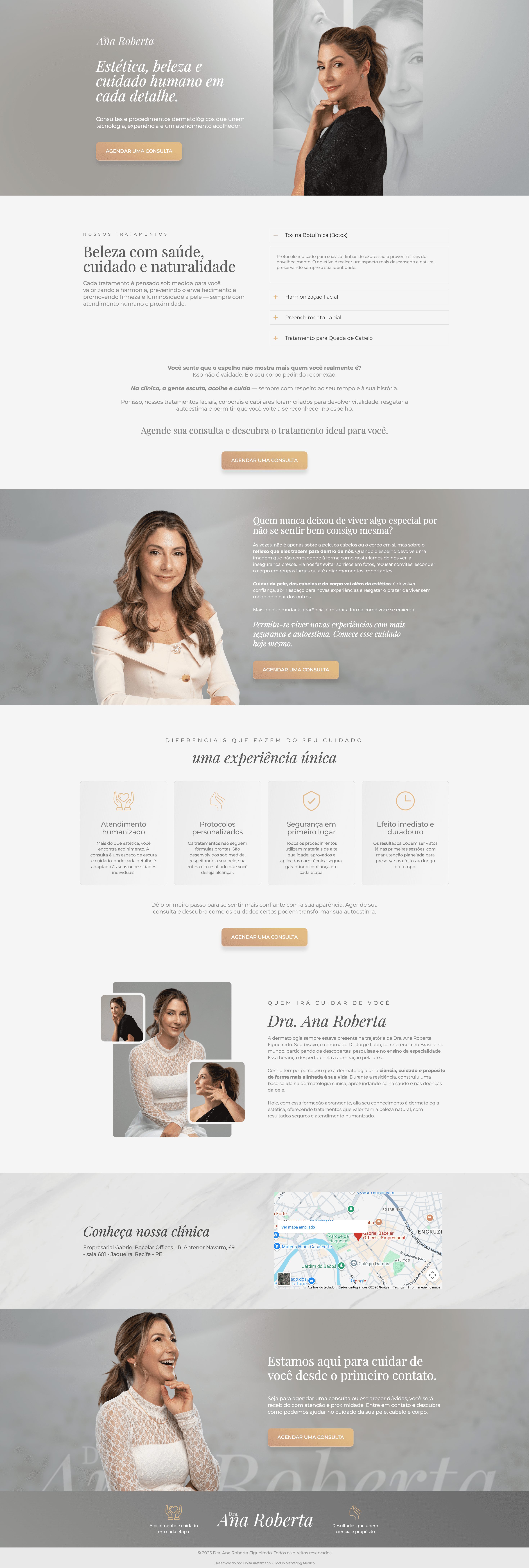 A landing page entrega uma experiência visual sofisticada, feminina e acolhedora, posicionando a Dra. Ana Roberta como uma profissional de estética premium que une conhecimento médico, sensibilidade estética e atendimento humanizado.